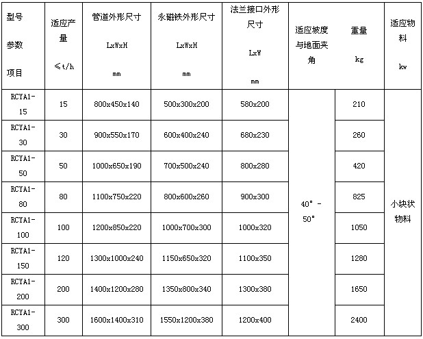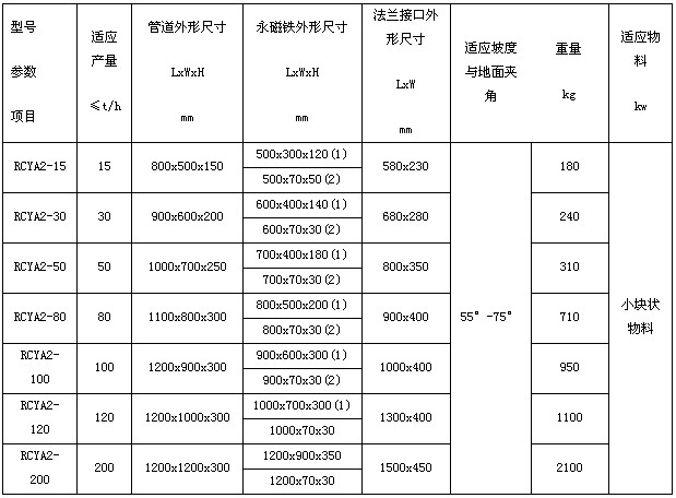 RCYA1、RCYA2系列管道式永磁除鐵器包括無(wu)磁(ci)(ci)(ci)(ci)(ci)管(guan)道(dao)和永磁(ci)(ci)(ci)(ci)(ci)鐵(tie)(tie)(tie)(tie)(tie)(tie)兩部(bu)分(fen),****于(yu)(yu)對封閉管(guan)道(dao)內(nei)非(fei)磁(ci)(ci)(ci)(ci)(ci)性物(wu)料(liao)除(chu)(chu)鐵(tie)(tie)(tie)(tie)(tie)(tie)、永磁(ci)(ci)(ci)(ci)(ci)除(chu)(chu)鐵(tie)(tie)(tie)(tie)(tie)(tie)器(qi)(qi)內(nei)部(bu)采用高性能(neng)稀(xi)土強磁(ci)(ci)(ci)(ci)(ci)材(cai)料(liao)組成復(fu)合(he)磁(ci)(ci)(ci)(ci)(ci)系。具有體積小、磁(ci)(ci)(ci)(ci)(ci)力大、重(zhong)量輕、除(chu)(chu)鐵(tie)(tie)(tie)(tie)(tie)(tie)干(gan)凈、方(fang)便、無(wu)能(neng)耗、使用壽(shou)命(ming)長等(deng)(deng)特(te)點。適合(he)于(yu)(yu)無(wu)輸(shu)送皮帶,只能(neng)提供下料(liao)溜槽的場(chang)合(he)。當散狀物(wu)料(liao)經過管(guan)道(dao)式(shi)永磁(ci)(ci)(ci)(ci)(ci)除(chu)(chu)鐵(tie)(tie)(tie)(tie)(tie)(tie)器(qi)(qi)時,鐵(tie)(tie)(tie)(tie)(tie)(tie)雜物(wu)被高場(chang)強的永磁(ci)(ci)(ci)(ci)(ci)鐵(tie)(tie)(tie)(tie)(tie)(tie)所(suo)吸附(fu),清除(chu)(chu)鐵(tie)(tie)(tie)(tie)(tie)(tie)雜質時,打開管(guan)道(dao)****門將雜質取出。該設(she)備適用于(yu)(yu)含鐵(tie)(tie)(tie)(tie)(tie)(tie)量較少的場(chang)合(he),含鐵(tie)(tie)(tie)(tie)(tie)(tie)較多的場(chang)合(he),應選(xuan)用自卸式(shi)除(chu)(chu)鐵(tie)(tie)(tie)(tie)(tie)(tie)器(qi)(qi)或RCYG系列精(jing)細除(chu)(chu)鐵(tie)(tie)(tie)(tie)(tie)(tie)器(qi)(qi)。主要應用于(yu)(yu)水(shui)泥、化工(gong)、煤炭、塑(su)料(liao)、耐火材(cai)料(liao)、建材(cai)等(deng)(deng)行業的下料(liao)管(guan)道(dao)中清除(chu)(chu)雜物(wu)。